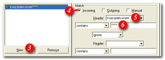 For example, if you wanted to consider anything with a score of 3 or more to be spam, the rule would look like: 'X-SpamDetect: ***'. Decreasing the number of asterisks will result in classifying more e-mails as spam. You may need to check your spam folder more carefully for non-spam e-mails that might have been classified as spam. If you wanted to rate anything with a score of 8 or greater as spam, the rule would look like: 'X-SpamDetect: ********'. Increasing the number of asterisks may result in fewer filtered e-mails being classified as spam and more potential spam staying in your Inbox.